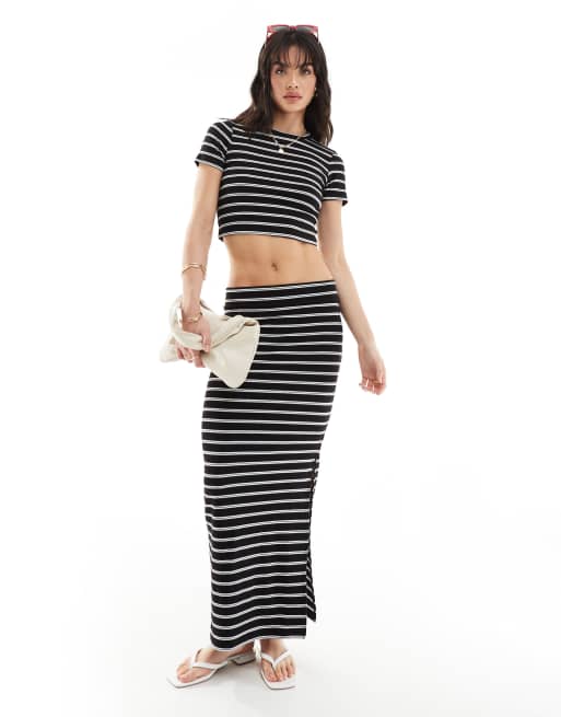 Pieces short sleeve cropped t shirt co ord in black and white stripe Very well made.