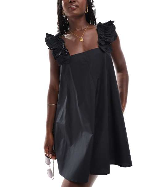 ASOS DESIGN cotton poplin mini dress with ruched bust detail in black Very well made.