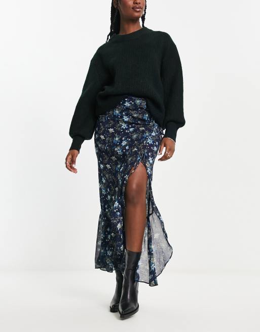 Free People tie side detail floral print boho maxi skirt in ink blue ASOS Very well made.