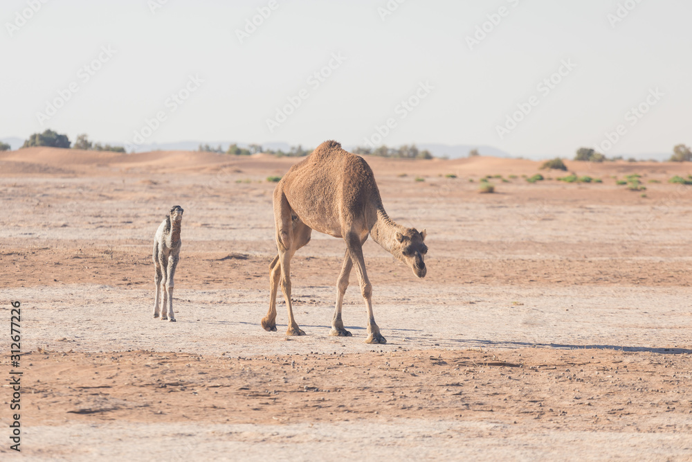 Baby camel and mother camel in Sahara desert among the small sand dunes beautiful wildlife near Very well made.
