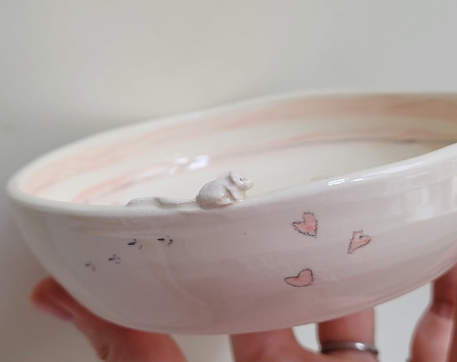 Hand made ceramic cat bowl with white mouse pin. Folksy Very well made.