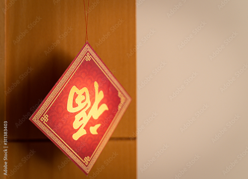 Chinese new year decoration with character FU displayed upside down on diagonal red square meaning good luck fortune and blessing. Stock Adobe Stock Very well made.