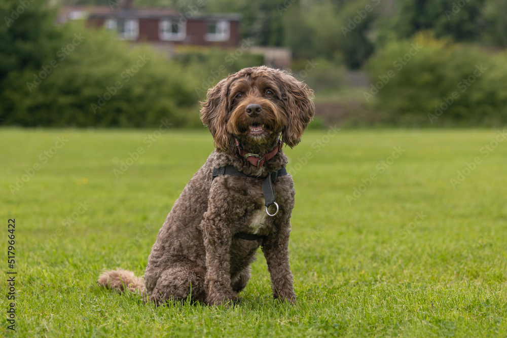Brown cockapoo wearing dog collar and harness sitting on the grass in a public park Stock Photo Adobe Stock Very well made.