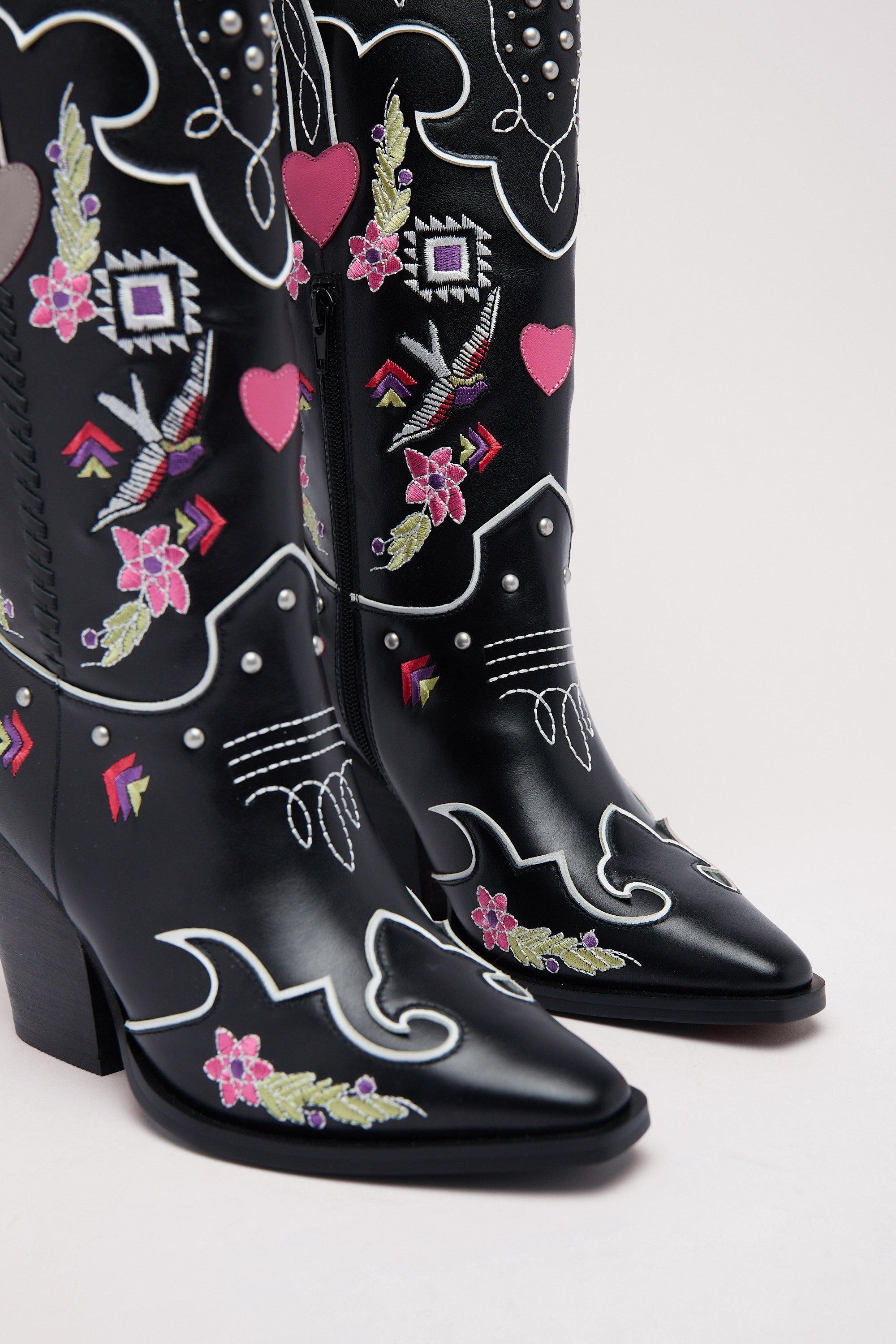Women s Floral Embroidery Cowgirl Square Toe Boots Black Very well made.