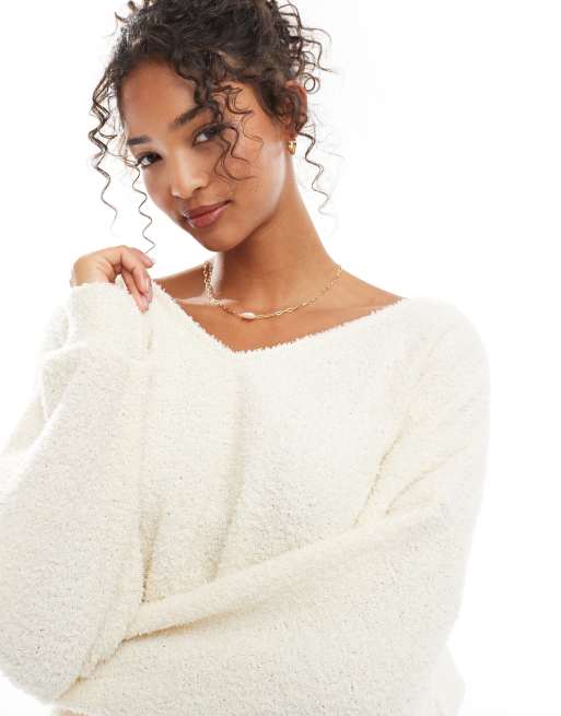 ASOS DESIGN fluffy boucle v neck sweater in cream Very well made.