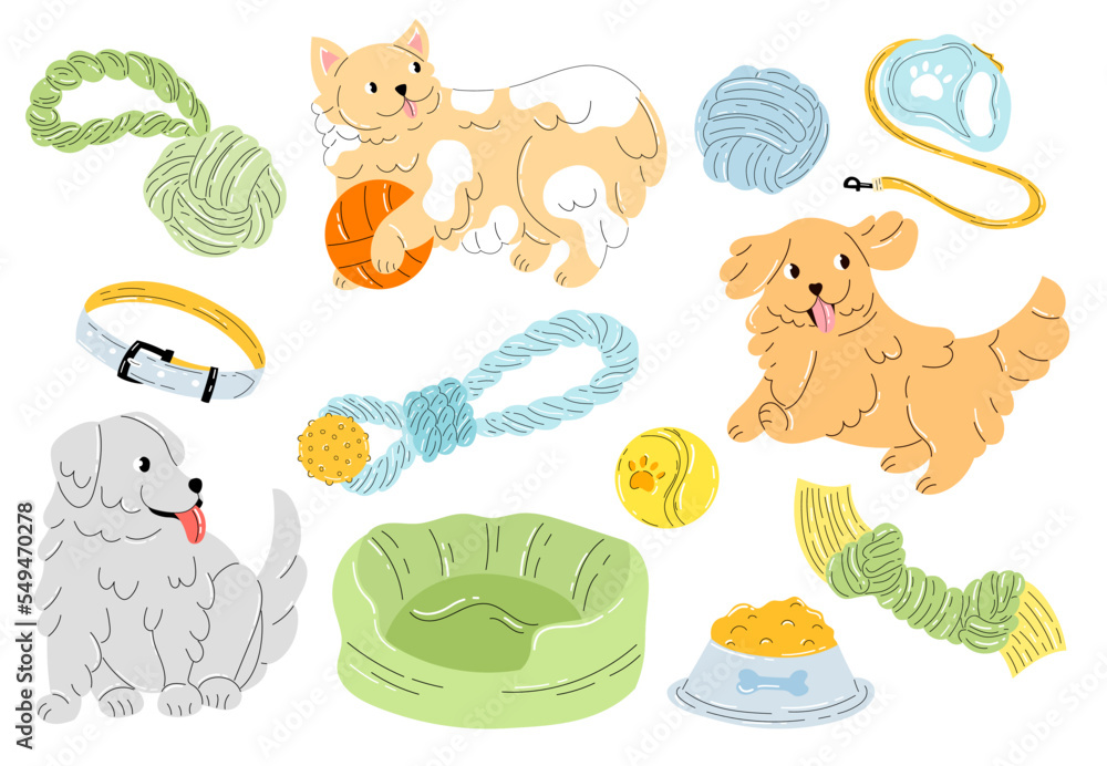 Cute fluffy puppies set with dog supplies isolated on white background. Dogs toy food bowl rope bone collar dogs bed. Adorable smiling little dog. Collection of dog accessories and supplies. Flat Very well made.