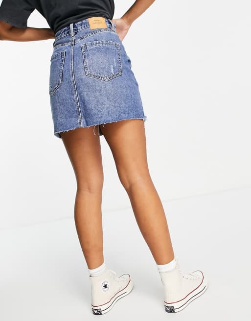 Stradivarius raw hem denim mini skirt in medium wash Very well made.