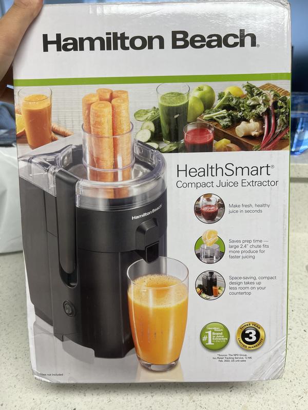 Hamilton Beach HealthSmart Compact Juice Extractor 400 Model 67500 Make fresh healthy juice in seconds Saves prep time large chute reduces precutting by 50 Space saving compact design Very well made.
