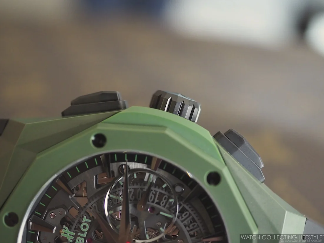 La Cote des Montres La montre Hublot Classic Fusion Aerofusion Chronograph Orlinski Mexico Green Ceramic Hommage a l independance a l espoir Very well made.