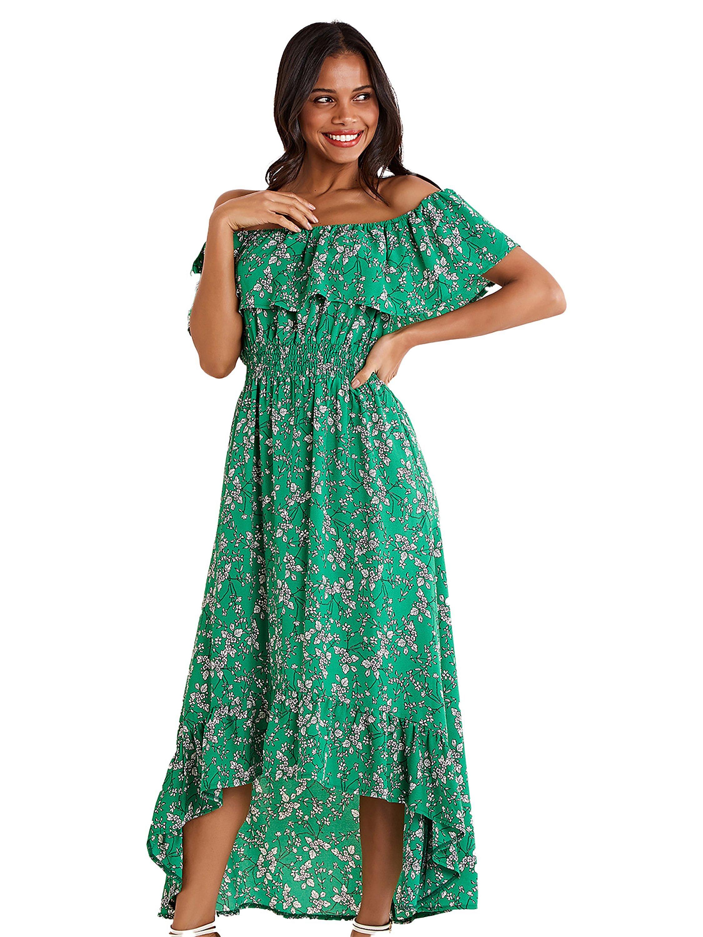 Mela London Ditsy Print Bardot Dipped Hem Dress Green Very well made.