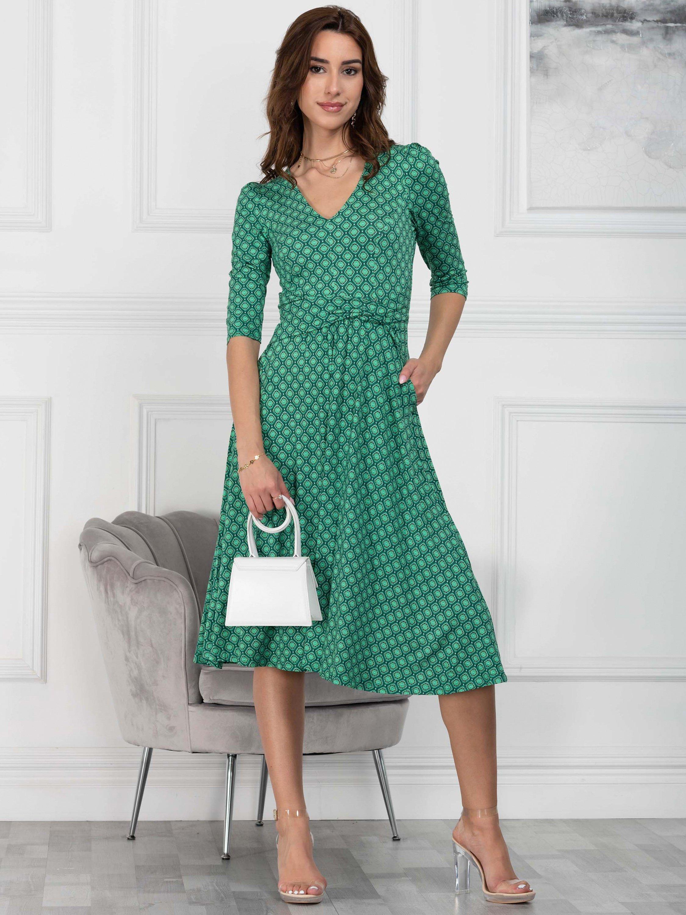 Jolie Moi Glynice V Neck Fit and Flare Dress Green Geometric Very well made.