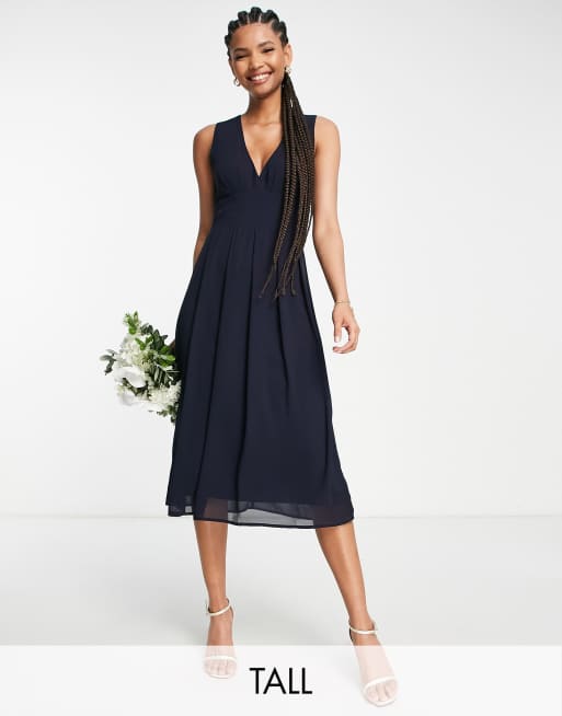 TFNC Tall Robe mi longue de demoiselle d honneur en mousseline avec col V a l avant et jupe plissee Bleu marine ASOS Very well made.