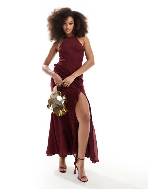 ASOS DESIGN Robe longue a volants coupee en biais avec col montant Baie Very well made.