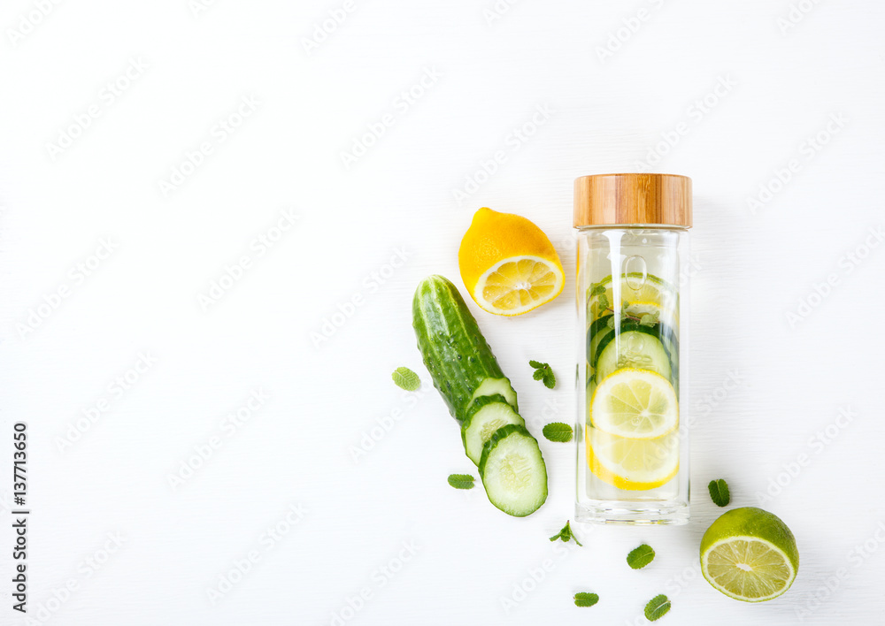 Detox Infused Water with Lemon Lime Cucumber and Mint in Sports Glass Bottle on a White Background.Healthy Beverage.Food diet concept.Vegetarian.Copy space for Text. selective focus. Stock Photo Adobe... Very well made.