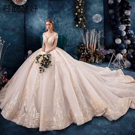 Wedding dress a word shoulder 2020 bride wedding dress palace luxury small long tail wedding dress Shopee Philippines Very well made.