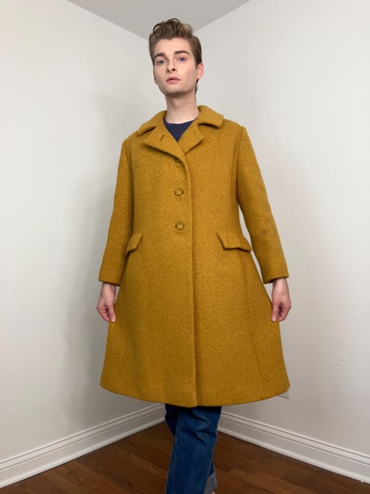 60s Marigold yellow wool boulce coat Mantis Lady Vintage Delaware OH Very well made.
