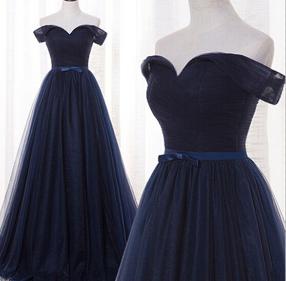 Viva Clothing Navy Blue Off The Shoulder Tulle Floor Length Dress Featuring Sweetheart Neckline and Pleated Bodice Very well made.