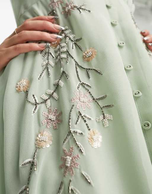 Hope Ivy embroidered plunge flutter sleeve midi dress in sage Very well made.
