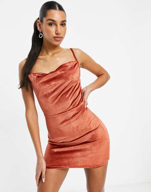 Parisian velvet cami strap mini dress with cowl neck in burnt orange Very well made.