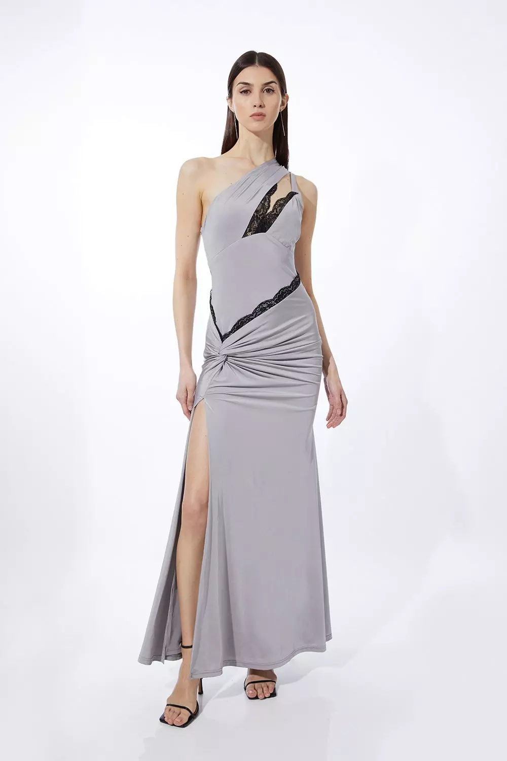 Karen Millen Womens Petite Lace Trim One Shoulder Jersey Maxi Dress Silver Size M Very well made.
