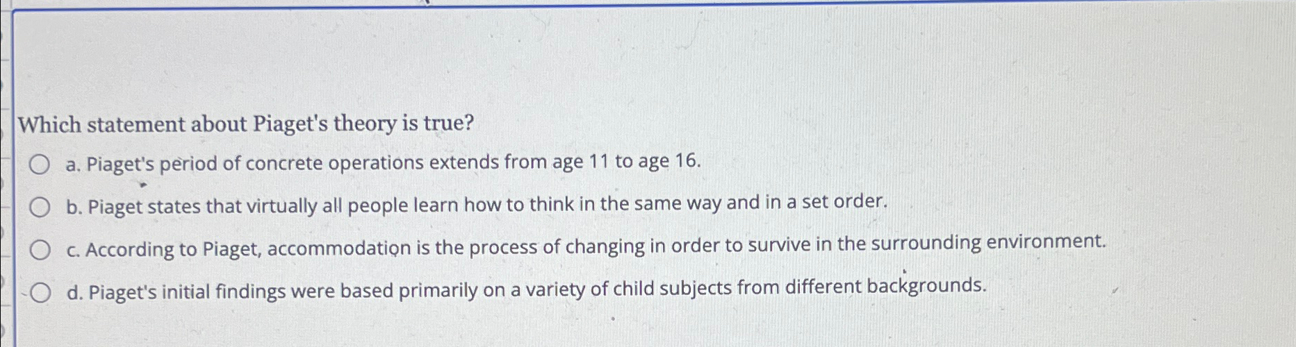 Solved Which statement about Piaget s theory is true a. Chegg Very well made.