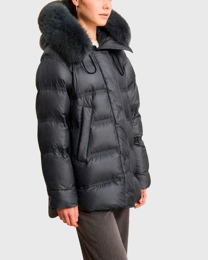 Piumino grigio svasato al fondo con bordo del cappuccio in pelliccia di volpe e spacchi con Very well made.