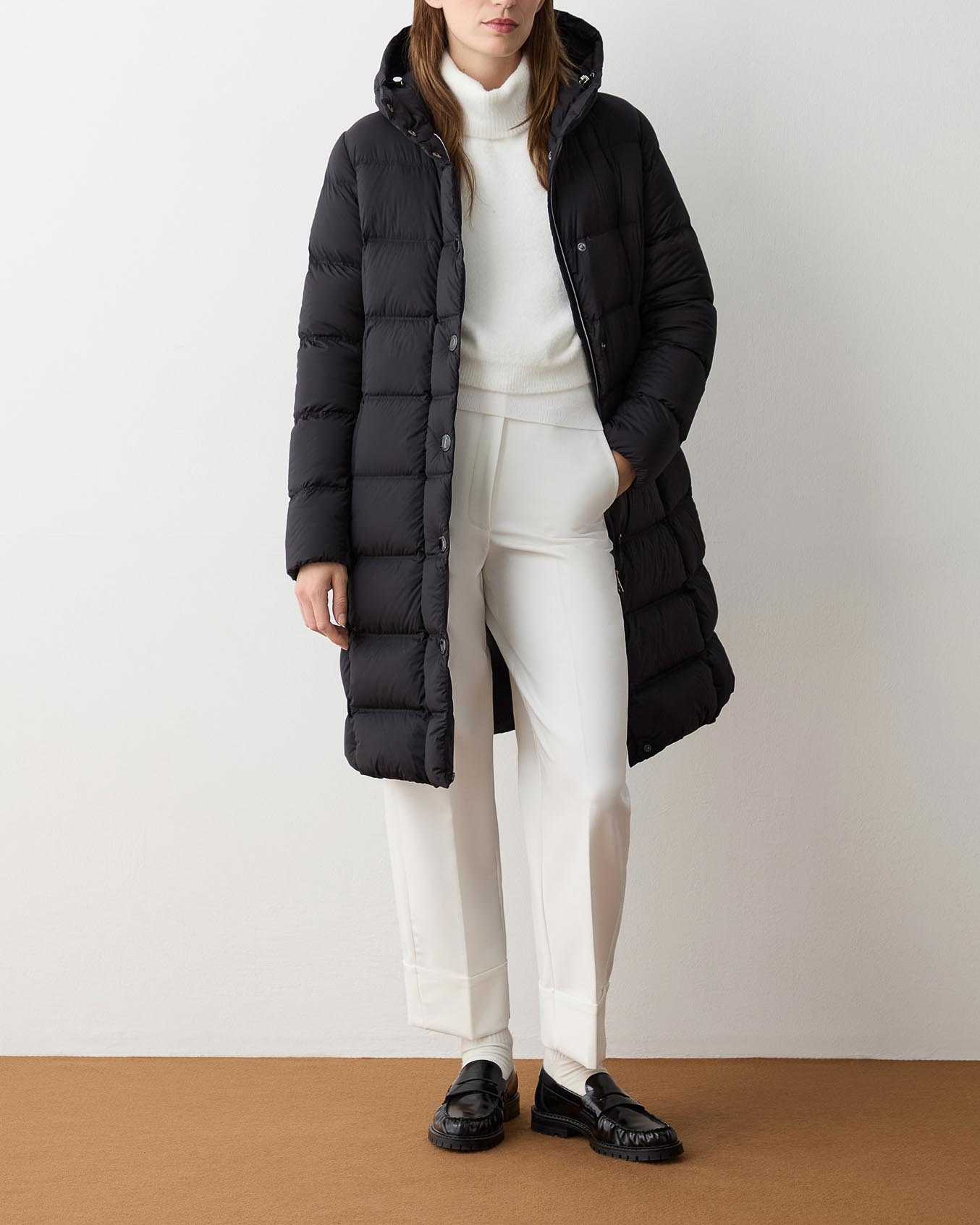Piumino nero media lunghezza in tessuto super leggero stretch con cappuccio e cintura in vita con Very well made.