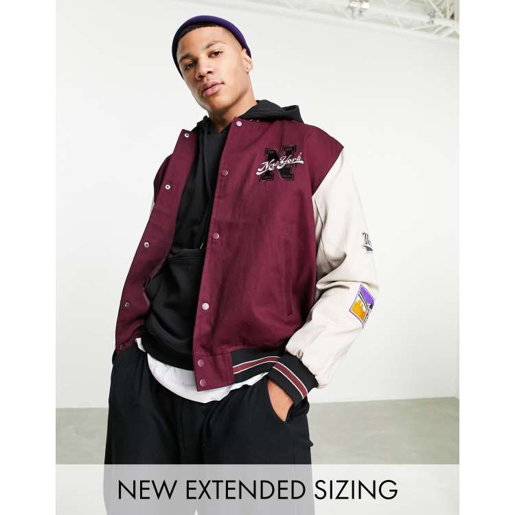 ASOS DESIGN oversized varsity bomber jacket in burgundy with badging ASOS Very well made.