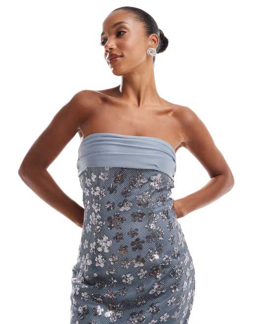 ASOS DESIGN floral sequin bandeau pencil midi dress with bow back sash detail in slate blue ASOS Very well made.