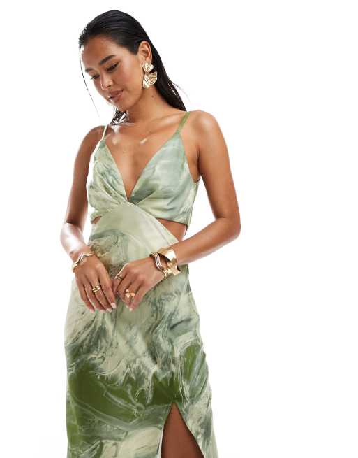 ASOS DESIGN satin cami strap pleated bust midi dress in green marble print ASOS Very well made.