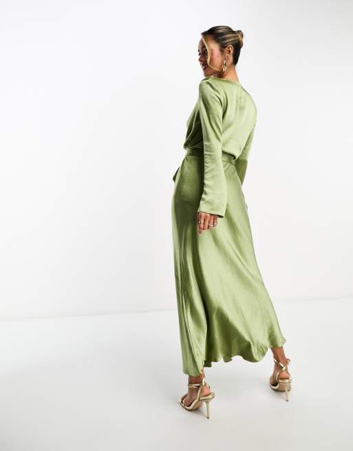ASOS DESIGN satin long sleeve wrap detail midaxi dress in khaki ASOS Very well made.
