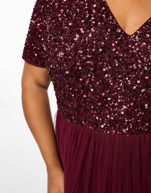 Maya Plus Bridesmaid short sleeve maxi tulle dress with tonal delicate sequins in wine Very well made.