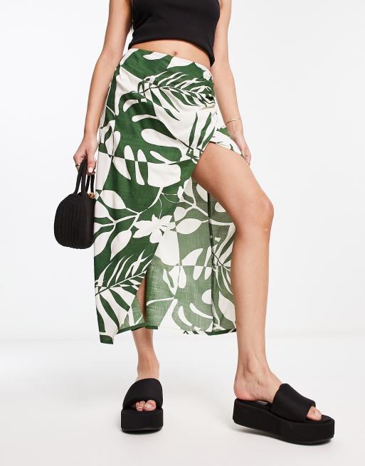 ASOS DESIGN natural slub ruched side midi skirt in green tropical print Very well made.
