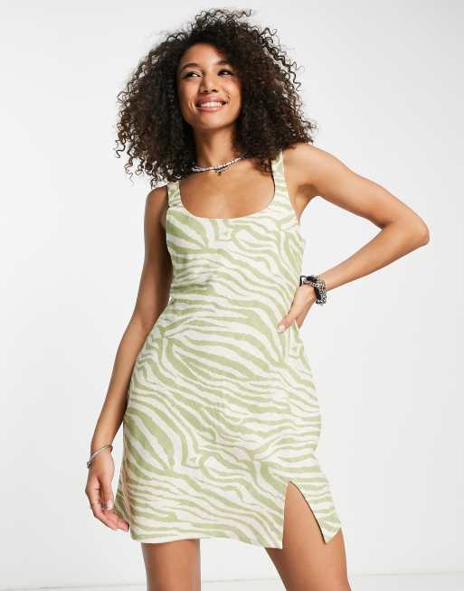 ASOS DESIGN linen scoop neck mini sundress with split in khaki zebra print Very well made.