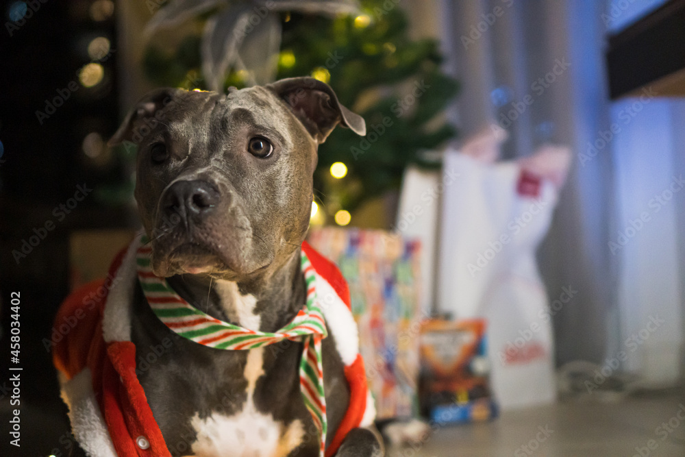 Poster Print Pit bull dog in front of the Christmas tree with the balls and lights on and some gifts 40x26.7 cm Very well made.