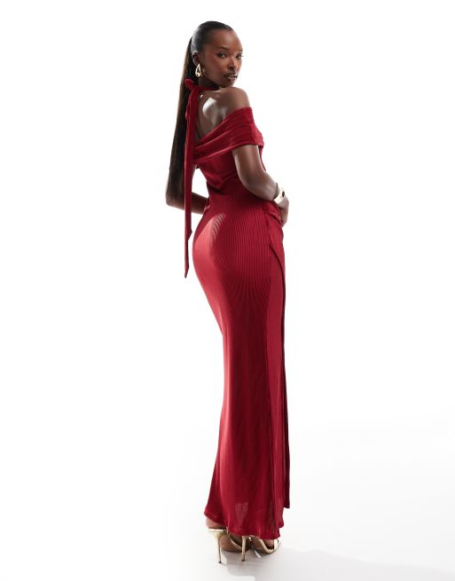 ASOS Design Plisse Bardot Midi Dress with Halter Strap Detail in burgundy Red Very well made.